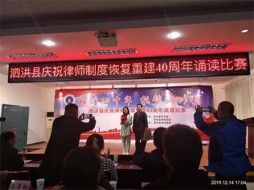 2019年12月14日,泗洪縣司法局、泗洪縣律師協(xié)會、泗洪縣讀書協(xié)會舉辦“慶祝律師制度恢復40周年誦讀大賽“,江蘇可行律師事務所劉倩倩律師以其精彩發(fā)揮摘得大賽一等獎。圖為頒獎現(xiàn)場。