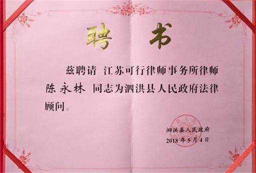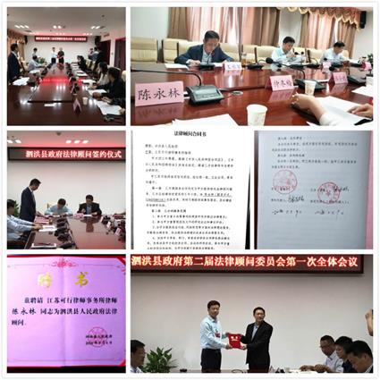 2018年5月4日,泗洪縣人民政府副縣長徐懷林同志、泗洪縣人民法院副院長翟良彥同志及江蘇可行律師事務(wù)所陳永林主任律師等人在泗洪縣人民政府會(huì)議室舉行首屆泗洪縣人民政府法律顧問簽約儀式。