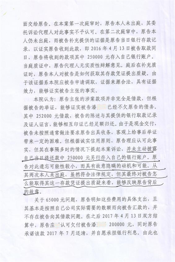 【庭審現(xiàn)場】莊某提供的證據(jù)有2016年4月11日分5次轉(zhuǎn)賬25萬元至潘某某銀行賬戶的銀行流水證明一份,用于證明25萬元借款本金已經(jīng)實(shí)際交付給潘某某。根據(jù)最高人民法院2015年9月1日施行的《最高人民法院關(guān)于審理民間借貸案件適用法律若干問題的規(guī)定》第十七條規(guī)定,原告僅依據(jù)金融機(jī)構(gòu)的轉(zhuǎn)賬憑證提起民間借貸訴訟,被告抗辯轉(zhuǎn)賬系償還雙方之前借款或其他債務(wù),被告應(yīng)當(dāng)對其主張?zhí)峁┳C據(jù)證明。被告提供相應(yīng)證據(jù)證明其主張后,原告仍應(yīng)就借貸關(guān)系的成立承擔(dān)舉證證明責(zé)任。顯然,潘某某收到25萬元是不可否認(rèn)的事實(shí)。潘某某向法庭提出證據(jù)是:25萬元的借條一式倆份原件兩張。證明自己償清25萬元并收回兩張借條原件。但莊某辯稱該兩張借條原件上均沒有莊某的簽名,該筆25萬元借款發(fā)生時,潘某某并未出具借條原件給莊某。第一次庭審因下班時間到了,而休庭。本人根據(jù)庭審中法官的態(tài)度敏銳的感知到法官是不相信被告潘某某的話,一般情況下,原告起訴被告且金額巨大,原告撒謊的可能性不大。而被告借錢拒不償還的情況實(shí)踐中發(fā)生較多。因此,第一次庭審基本上宣告了被告潘某某敗訴的結(jié)果。